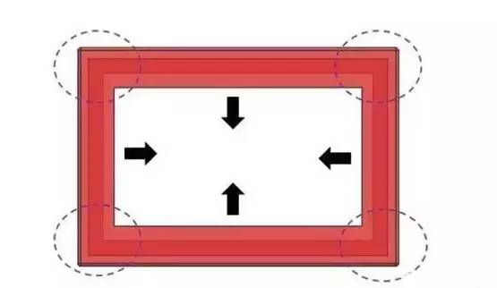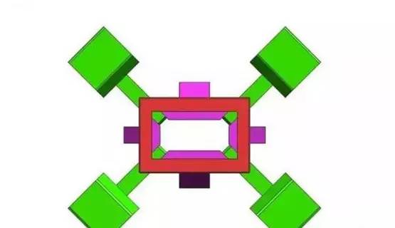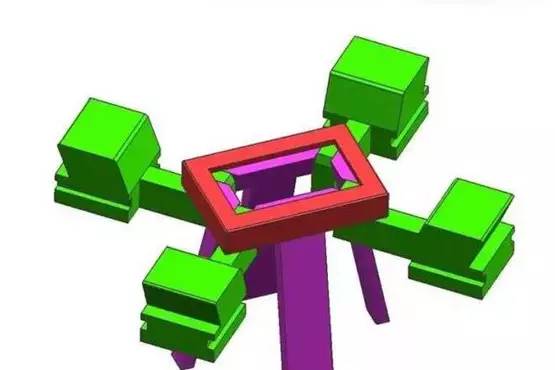碰到此類產(chǎn)品,我們首先會考慮能不能做斜頂,但通過分析,做斜頂4個(gè)角落位置的倒扣無法脫離(箭頭方向做斜頂) 2.方案 斜頂無法完全脫倒扣,我們只能考慮能否用斜頂+內(nèi)滑塊的方式進(jìn)行設(shè)計(jì)。如下圖所示,綠色部件為內(nèi)滑塊,粉紅色部件為斜頂。