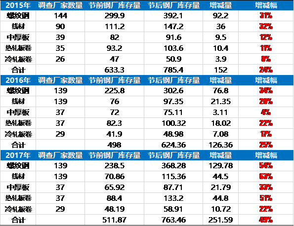 據(jù)Mysteel節(jié)后對(duì)樣本鋼廠的調(diào)研數(shù)據(jù)來看,各品種廠內(nèi)庫(kù)存的增幅較前兩年均有明顯增加。