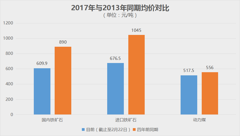 對(duì)鋼鐵生產(chǎn)企業(yè)來說,目前可以算是一個(gè)美好的時(shí)代,因?yàn)殇搩r(jià)創(chuàng)下新高,但原燃料成本卻并沒有恢復(fù)到相應(yīng)的水平,讓此前長(zhǎng)期在虧損邊緣掙扎的鋼鐵生產(chǎn)企業(yè)終于有了豐厚的盈利。蘭格鋼鐵云商平臺(tái)數(shù)據(jù)監(jiān)測(cè)顯示,截止到2月22日,相關(guān)價(jià)格與四年前同期對(duì)比如下: