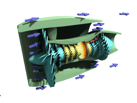 渦輪風扇發(fā)動機,大型運輸機的發(fā)動機。渦扇氣路兩條,外邊這條提供基本70-80%的推力,里邊這條僅提供20-30%的推力。